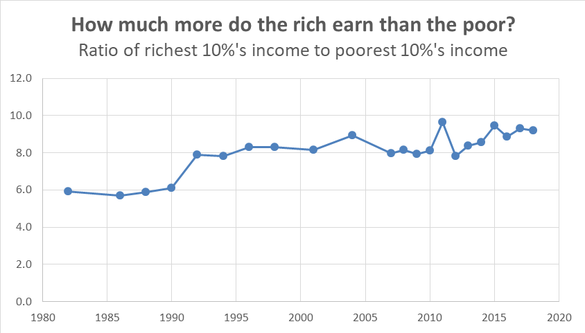 The graph at left shows another way to put it: someone in the richest 10% used to earn five-six times as much as someone in the poorest 10%, but now they earn nine times as much. (Data from Perry, 2019, p.314.)