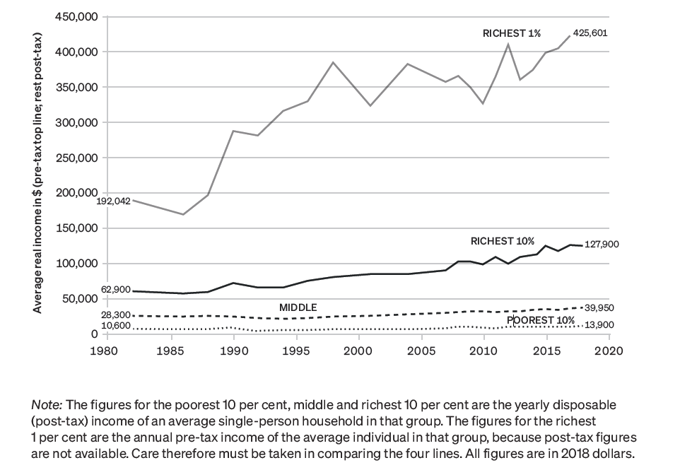 In New Zealand, income (and probably wealth) was being shared out more and more evenly from the 1950s up until the 1980s – but for the next two decades we had the developed world’s biggest increase in income inequality. (More information on the history of inequality in New Zealand is available here.) As the graph (at left) shows, the average income (before tax) of someone in the richest 1% has doubled, from just under $200,000 to over $400,000. In contrast, the average disposable (after tax) income for someone in the poorest 10% is only one-third higher than it was in the 1980s. (Rashbrooke, 2021, p.50.) Some New Zealanders have enjoyed income gains far in excess of their contribution to society (which does not appear to have doubled in recent decades), while many others struggle to pay their bills and lead a decent life. (Survey issues mean there is no after-tax income data for the richest 1%. If it were, the line for the 1% would be lower than shown. However, the basic trend of a doubling of income would remain, and might even be greater, given that taxes levied on the 1% have fallen during this period.)
