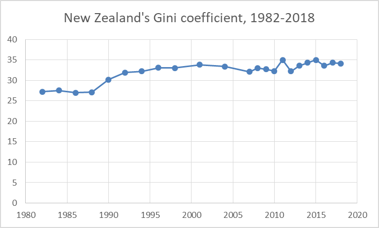It is not entirely clear what has happened to economic inequality under the post-2017 Labour governments led by Jacinda Ardern. Data released in early 2022 by Statistics New Zealand indicates that income inequality has reduced, the Gini coefficient falling from 32.7 in 2018 to 31.7 in 2021. This is a different data series to the graph above, however, making long-term comparisons difficult.